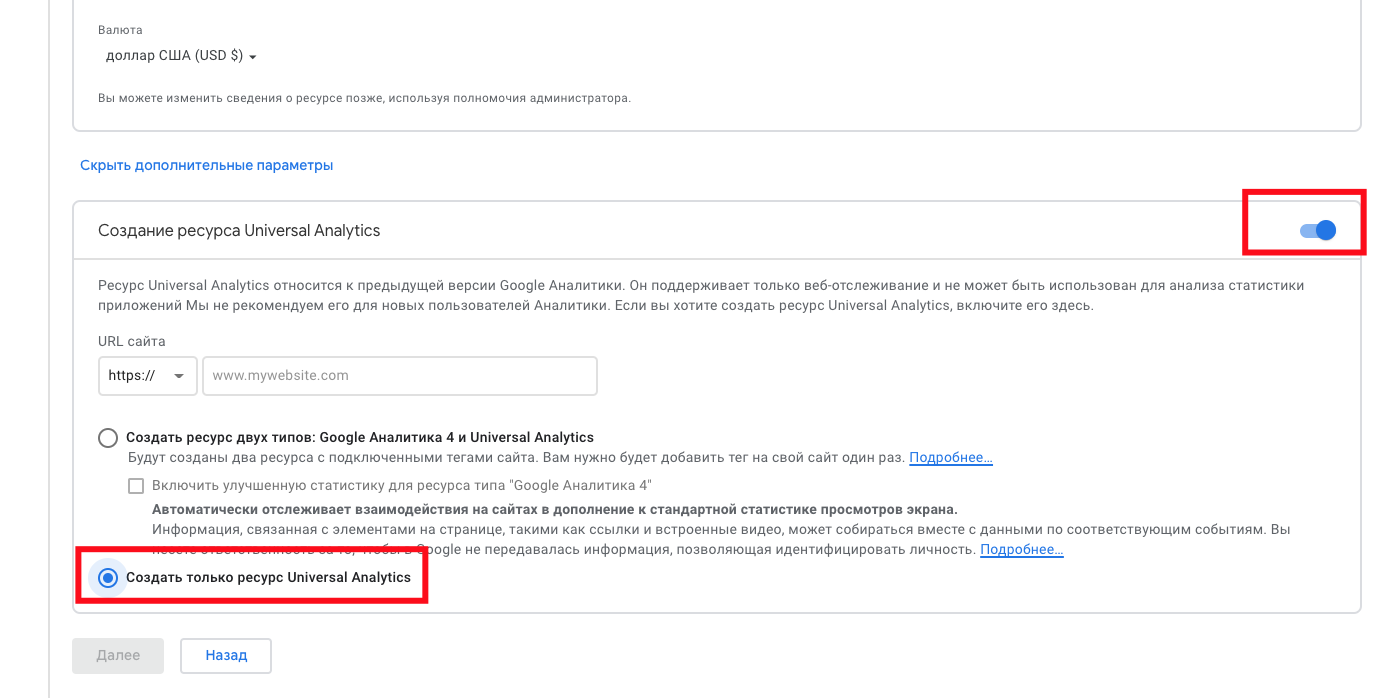 5) Вибираємо “Створення ресурсу Universal Analytics” і ставимо галочку проти “Створити тільки ресурс Universal Analytics”. *не забуваємо вказати URL сайту