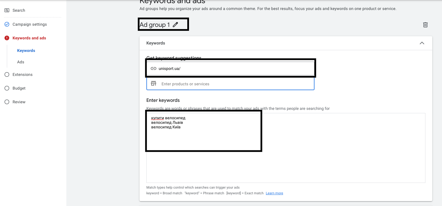 • Далі даємо назву группі оголошень, додаємо наш сайт та ключові слова(слова, які будуть вводити ваші кліенти і по якім ви бажаєте здійснити показ). Звісно, ключові слова потрібно збирати через спеціальні сервіси, проте не перших кроках можете додати ті, які ви вважаєте цільовими. Не рекомендуємо додавати ключові слова в широкій відповідності, отже не забудьте кожну фразу взяти в лапки.