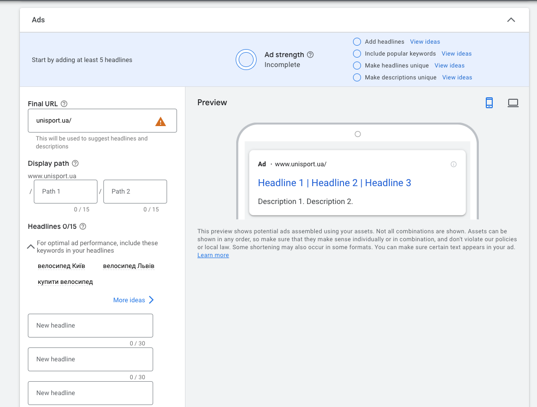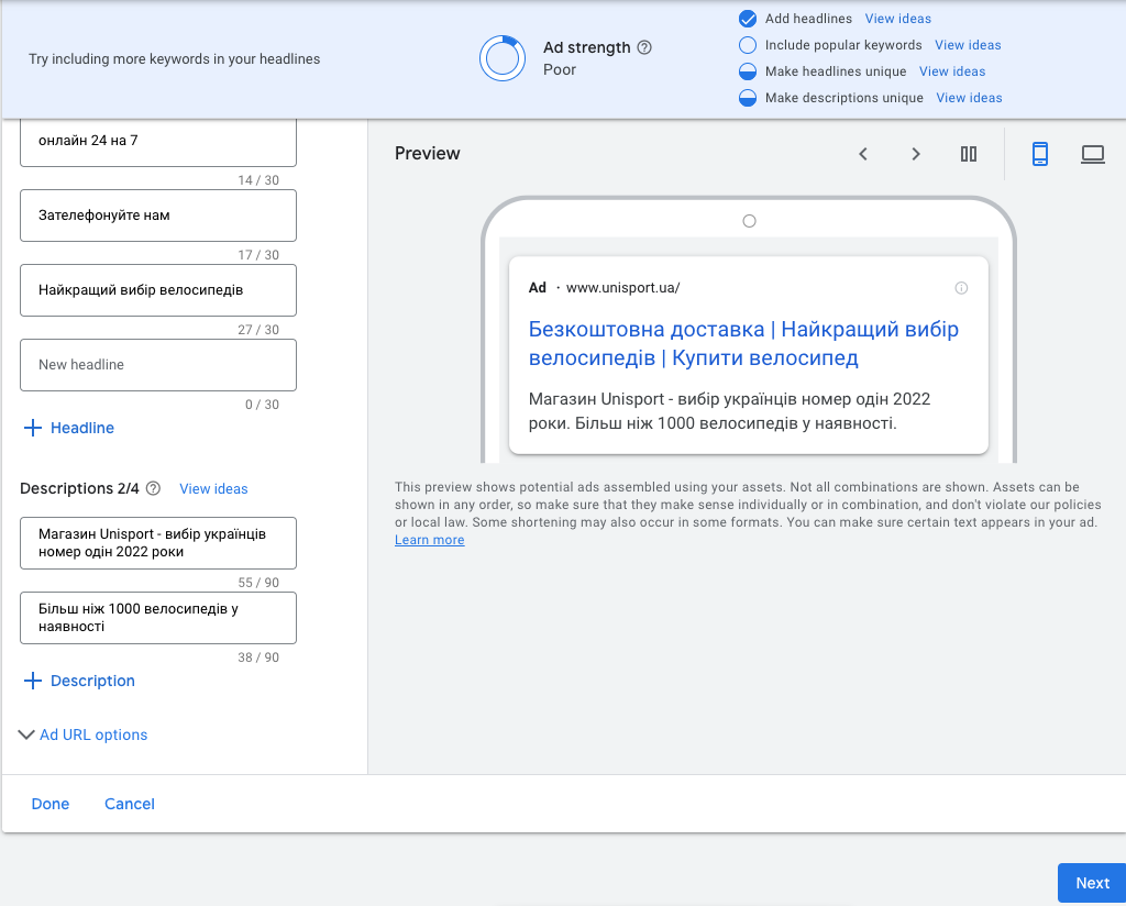 • Далі нам потрібно створити оголошення. Для цього потрібно додати заголовки(до 30 символів), описи(до 90 символів). Далі натискаємо кнопку “Next”