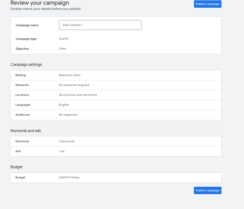 • Це останній крок у настройці. Google дає нам подивитись ще раз на наші налаштування та пропонує публіковати кампанію.