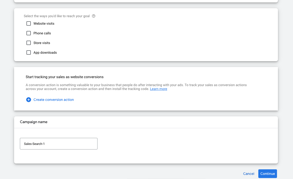 • Далі Google пропонує вибрати шляхи, якими ви хочете досягти своєї мети “website visits”, “phone calls” і тд. Потім бажано додати ціль(в більшості випадків це сторінка “дякую”, її можна додати після зв’язки Google Analytics(GA4) та Google Ads. Далі вказати назву кампанії та натиснути кнопку “продовжити”