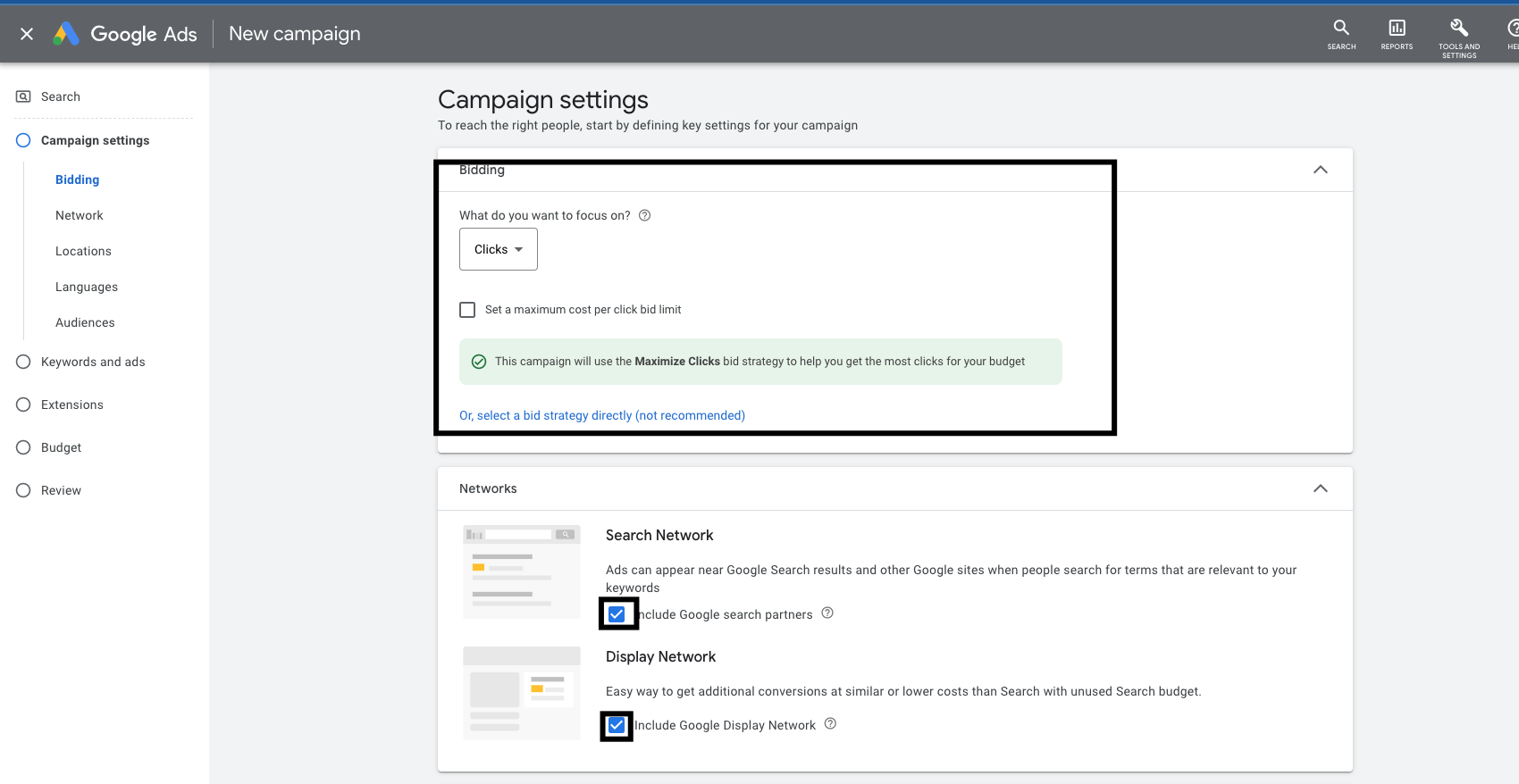 • Далі Google пропонує вибрати стратегію по оплатам(на чому буде фокусуватись Google). На перших кроках ми би рекомендували сфокусуватись на кліках на вказати максимальну ціну за клік(яку ви готові платити). Після цього потрібно буде вирішити, будемо ми показуватись в Контекстній мережі та на сайтах партнерах Google(рекомендували би почати без них).