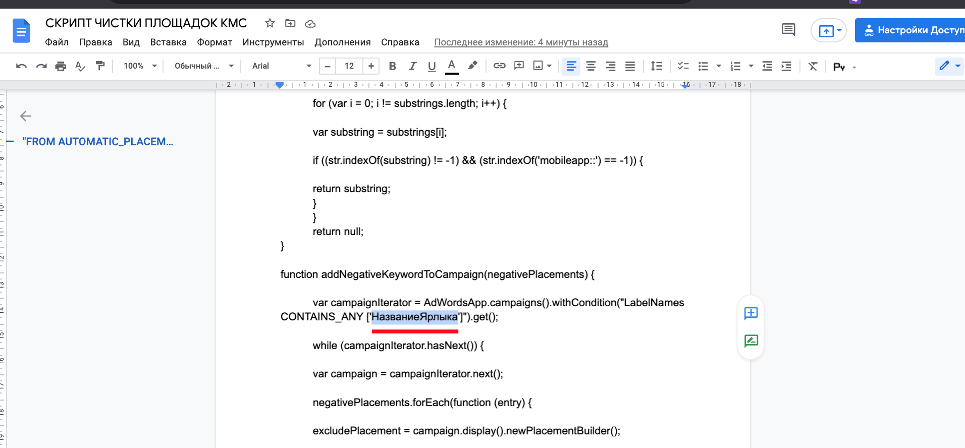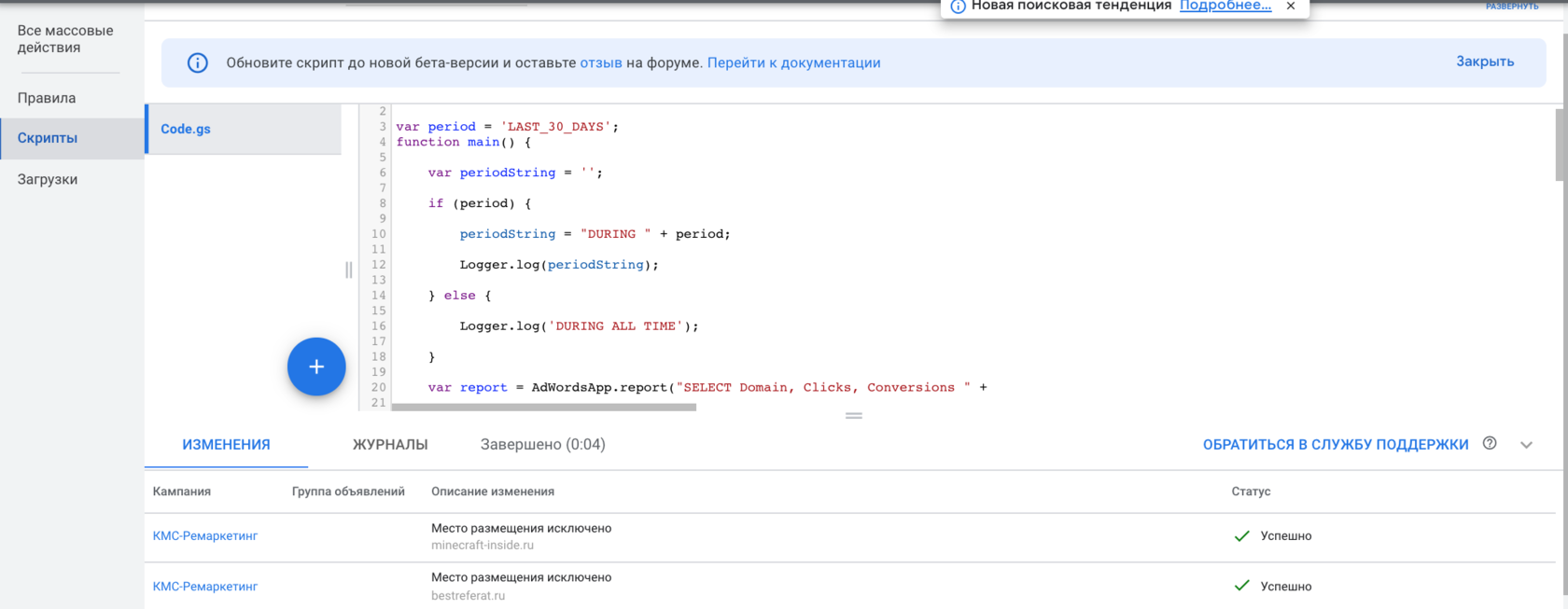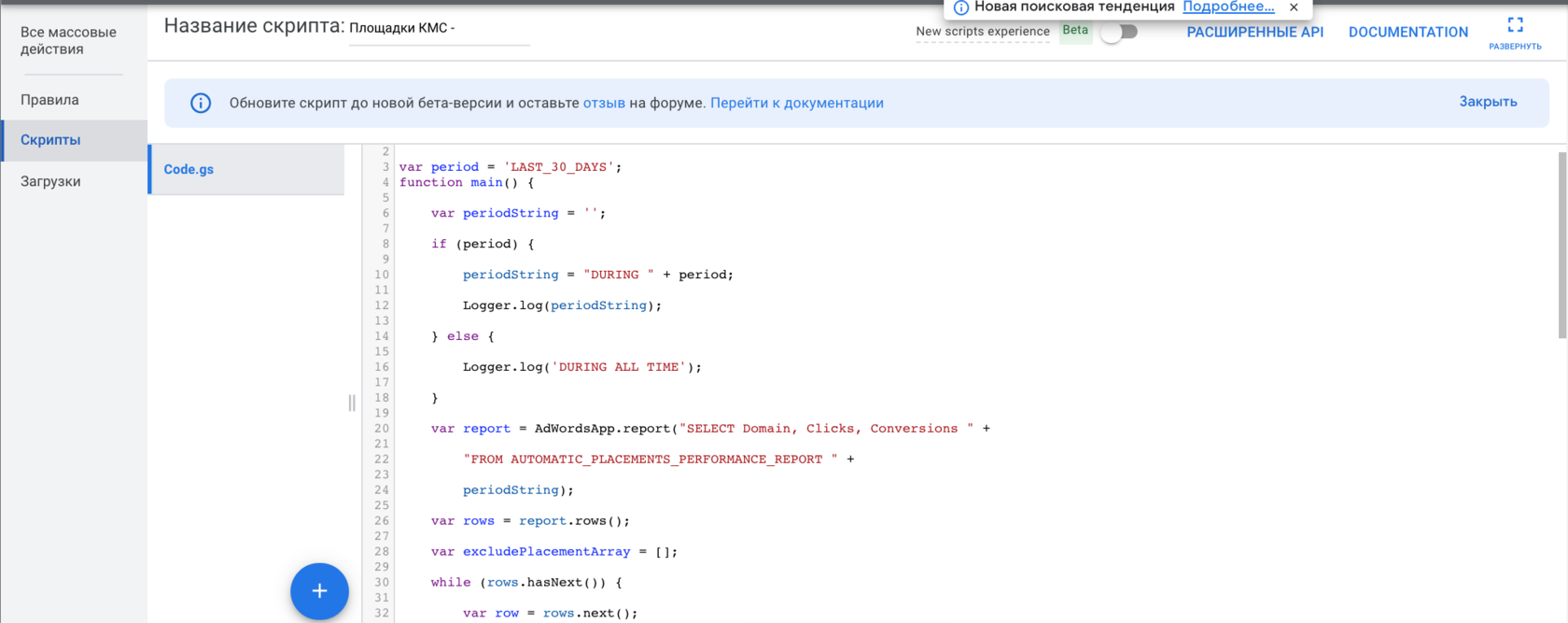 Тепер настав час поділитись ще одним скриптом. Даний скрипт дозволяє автоматичне чищення майданчиків у Google Ads, виходячи з тексту в назві сайту (url). На ваше бажання можна додавати ваші “особисті” назви, виходячи з досвіду або розуміння ніші.